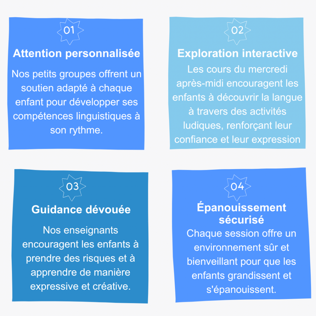 Les mercredis après-midi prennent une nouvelle dimension avec les cours pour enfants de Practice Language House. Nos cours sont conçus pour offrir à vos enfants une expérience d'apprentissage stimulante et enrichissante, où ils peuvent développer leurs compétences linguistiques, leur confiance en eux et leur amour pour l'apprentissage.