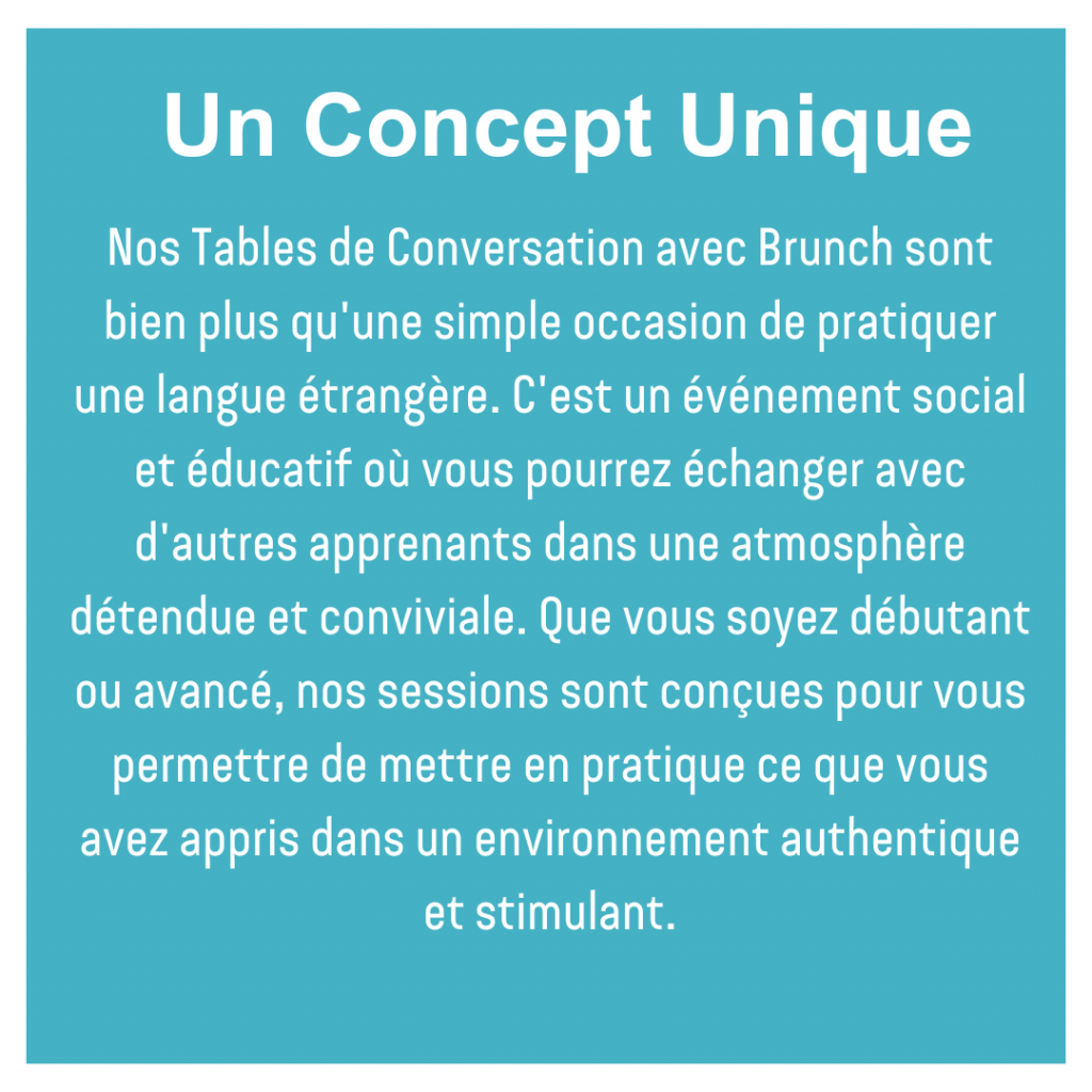 Chez PLH, nous croyons en l'apprentissage dynamique et ludique des langues, où chaque moment est une occasion de pratiquer et de s'améliorer. Nos Tables de Conversation avec Brunch offrent une expérience enrichissante qui allie l'aspect social d'un repas convivial à la stimulation intellectuelle de la pratique linguistique. Pendant ces sessions de 2 heures, vous découvrirez comment nous avons soigneusement conçu cet événement pour vous permettre de développer vos compétences linguistiques tout en vous régalant de délices culinaires.